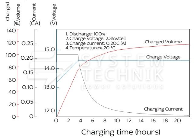 - Рекомендуемое напряжение заряда в циклическом режиме для 12В батареи: 13,5В-14,1В при 25ºС;